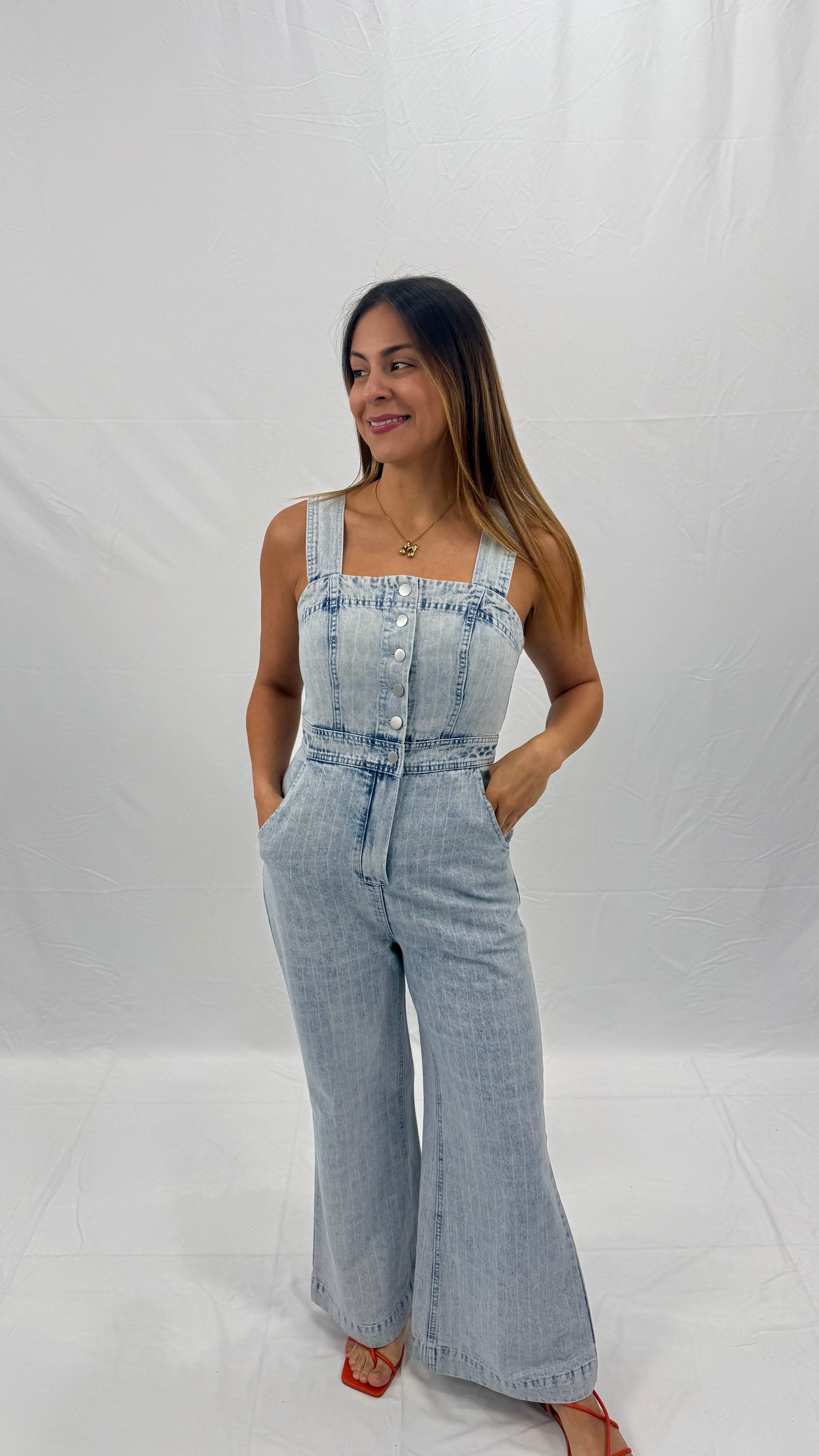 Este jumpsuit lo tiene todo: silueta estilizada, aire retro y actitud de “aquà llegué yo”. El mahón claro con textura sutil de rayas verticales alarga visualmente tu figura, mientras que los botones al frente y el escote cuadrado enmarcan tu torso con un toque moderno y femenino. La espalda semi abierta y el corte recto en las piernas le dan un vibe relajado, sin dejar de ser sofisticado.