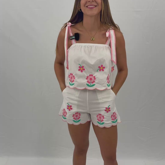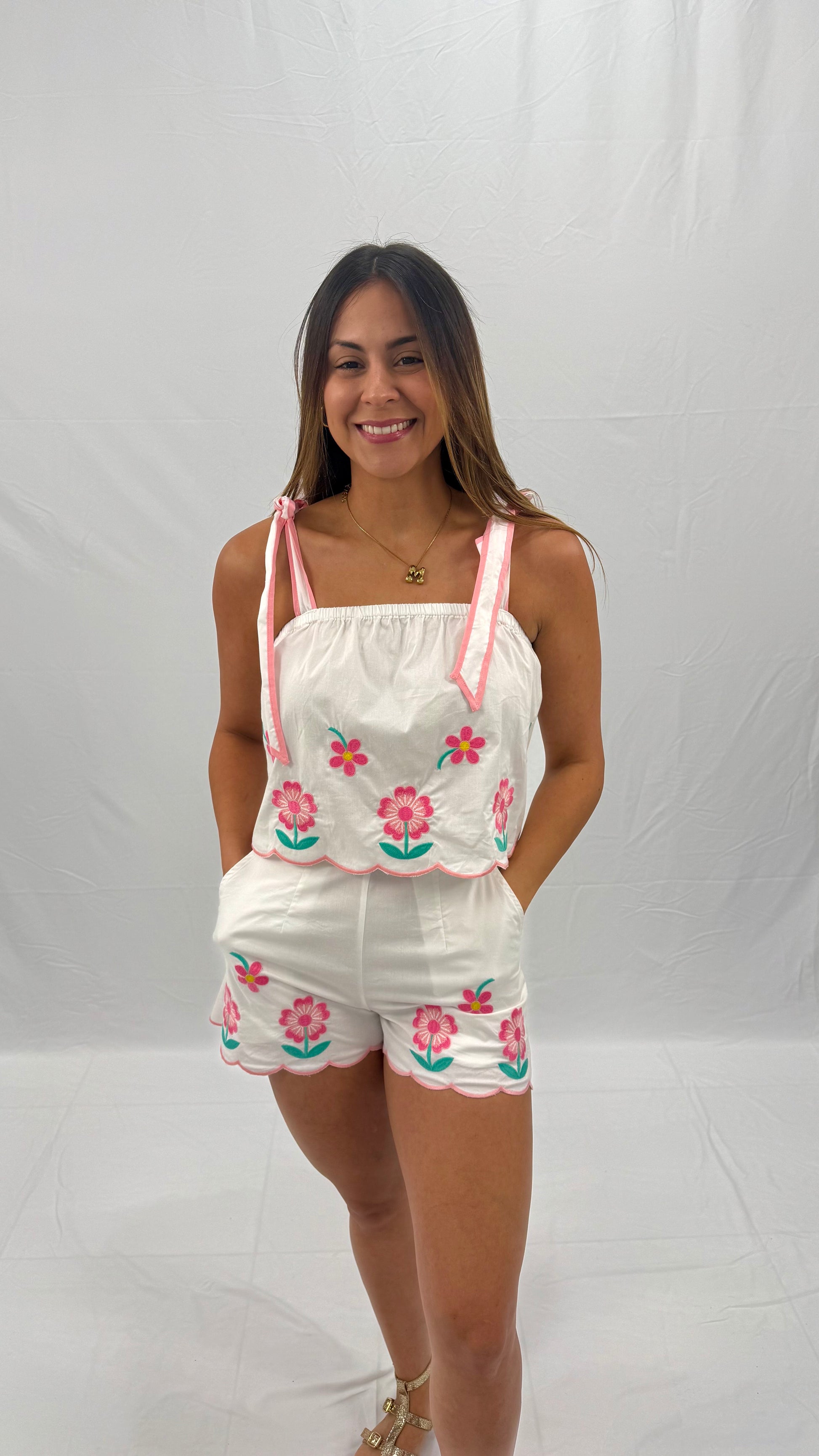Short de cintura alta, con bolsillos laterales y el mismo detalle bordado en ruedo ondulado.