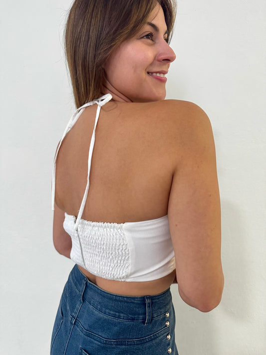 Pearl Embellished Floral Halter Crop Top, Cotton and Linen, Small, Medium & Large